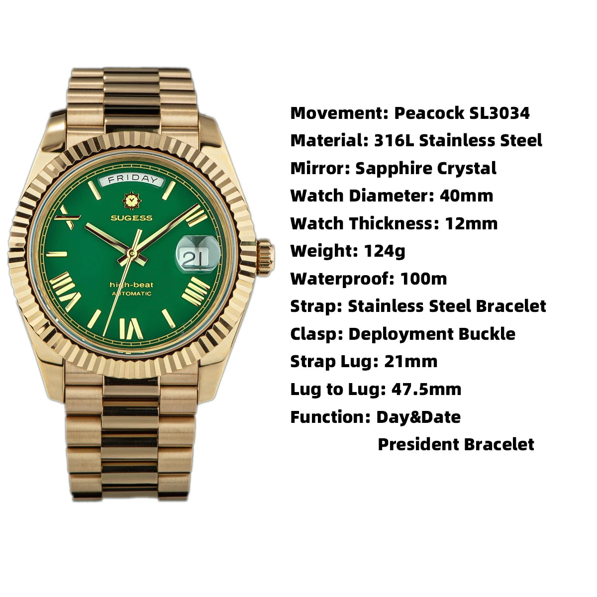 2023 New Sugess Watch of Men 40mm Day Date Automatic Dandong SL3034 Movement Retro Mechanical Wristwatch Sapphire Glass Golden