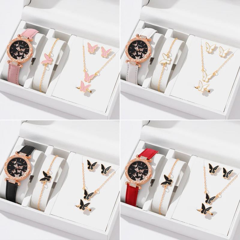6PCS/Set Simple Element Dial Quartz Women's Watch Latex Strap Butterfly Necklace Bracelet Earrings Ring Jewelry Set Girls Gift