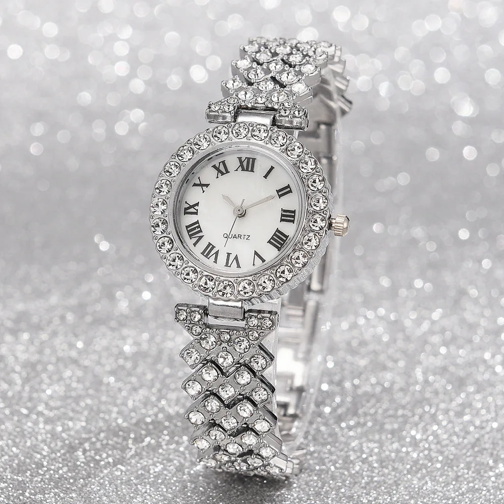 Fashion Luxury Full Crystal 5 Pcs Watch Necklace Earrings Ring Set for Women Rhinestone Wristwatch Female Bracelet Set Gift