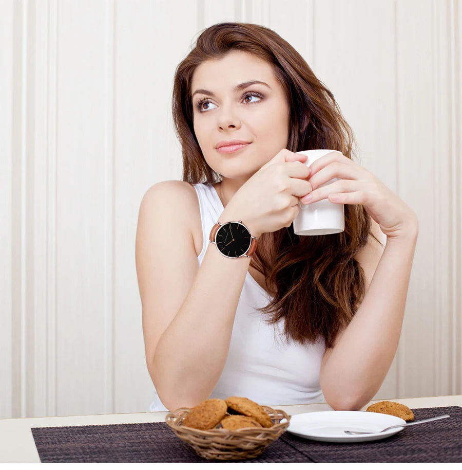 Its smooth leather strap, slim analog dial, and water-resistant build make it the perfect everyday companion — whether you’re conquering deadlines, enjoying coffee breaks, or attending evening events.