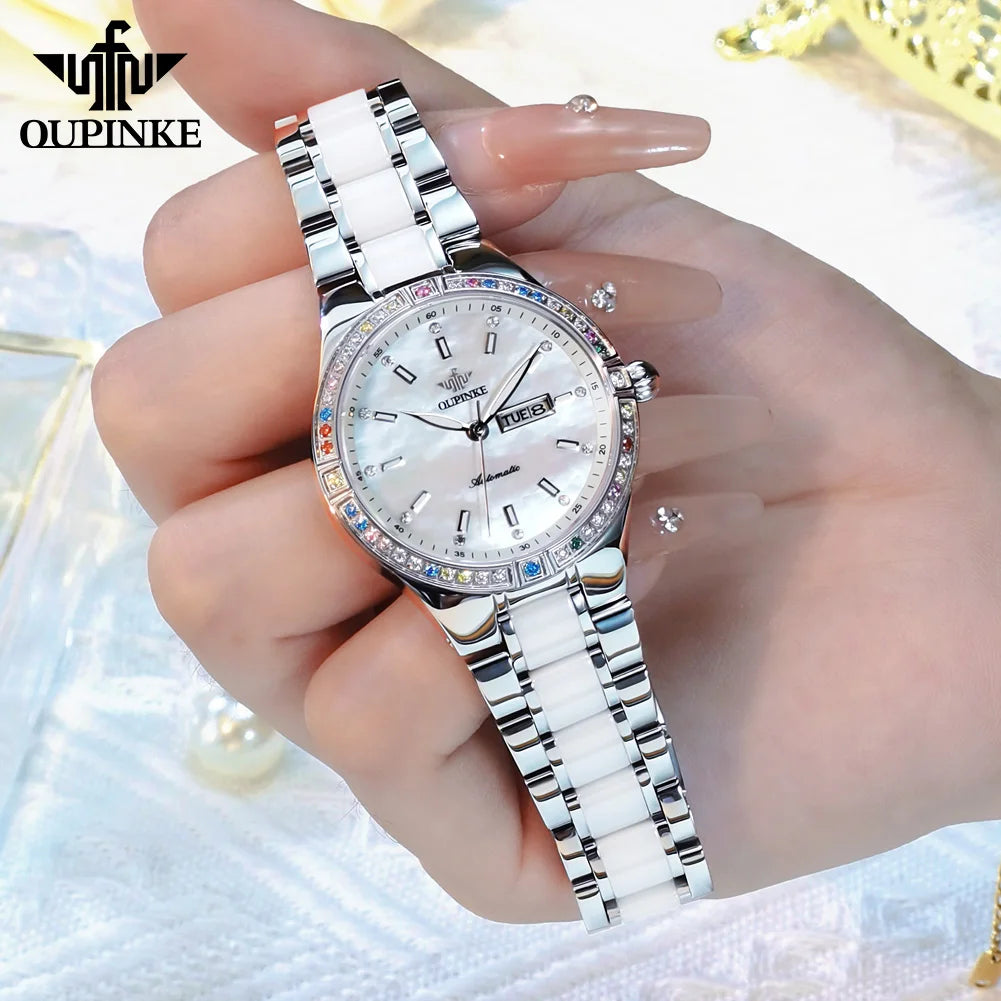 OUPINKE 3283 Women's Watch Luxury Dual Calendar Automatic Watch For Women Waterproof Mechanical Wristwatch Ceramic Steel Strap