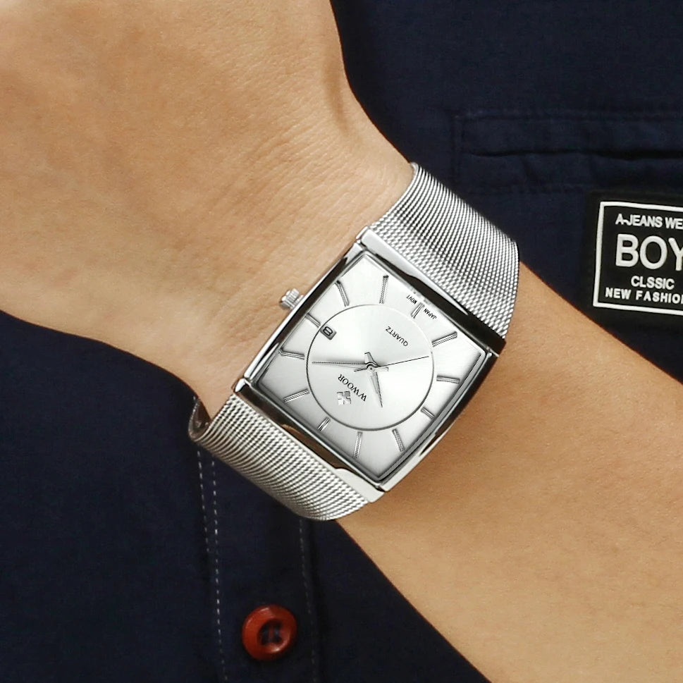 WWOOR Luxury Gold Watch Men Square Japan Quartz Slim Steel Mesh
